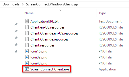 - Click ScreenConnect.WindowsClient.zip to open the ZIP file. You'll see a few files in the ZIP file. Double-click the file named ScreenConnect.Client.exe: