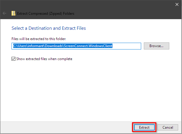 - Your browser will automatically download a ZIP file named ScreenConnect.WindowsClient.zip: